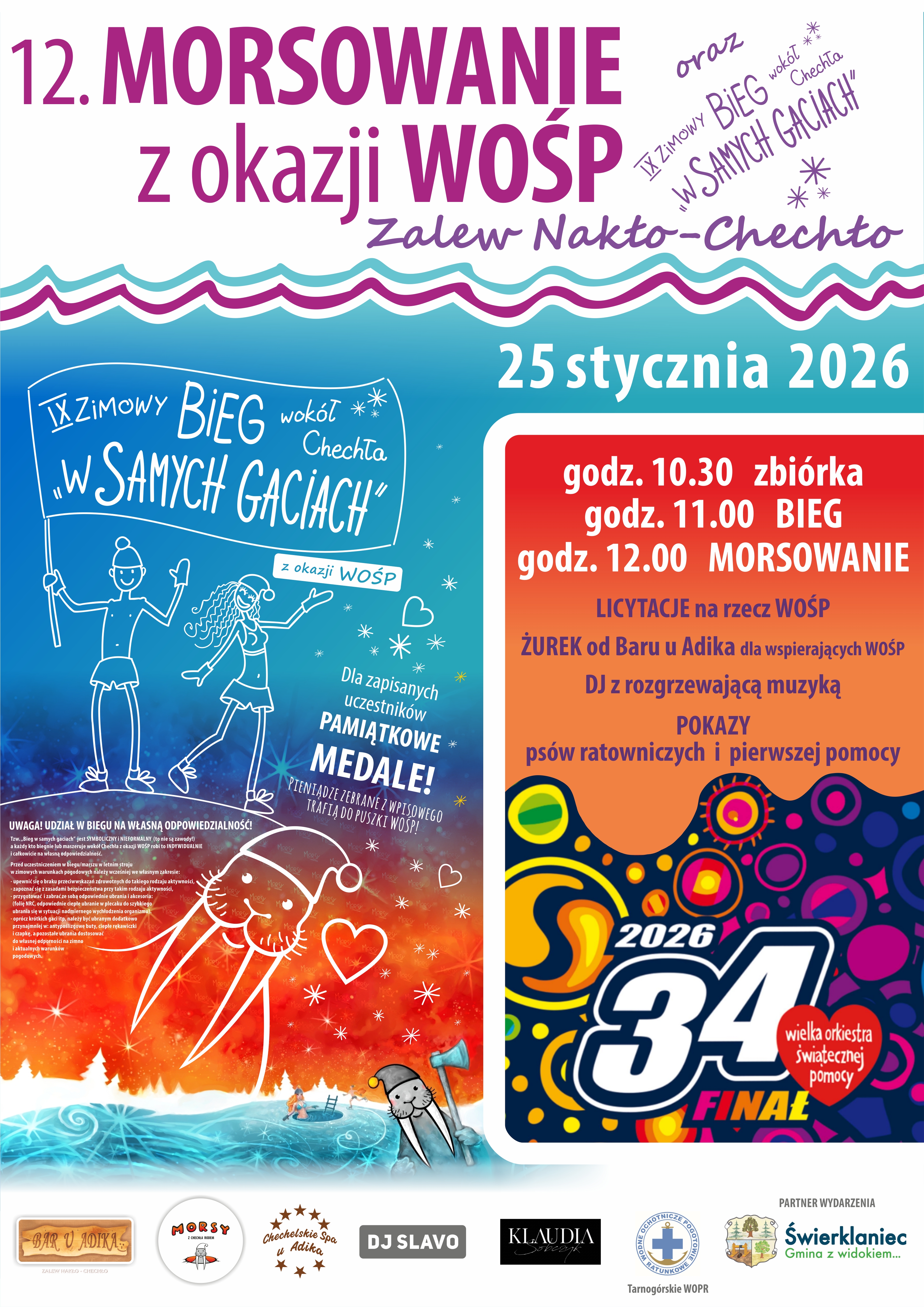 W niedzielę, 25 stycznia, od wczesnych godzin porannych na terenie gminy będzie się naprawdę dużo działo. Jako pierwsi, wydarzenia związane z Wielką Orkiestrą Świątecznej Pomocy, zainaugurują Morsy z Chechła Rodem. Tradycyjnie zaproszą nad Zalew Nakło–Chechło. A w planach mają IX Bieg w Gaciach wokół Chechła oraz wośpowe morsowanie, które co roku przyciąga zarówno uczestników, jak i licznych widzów.